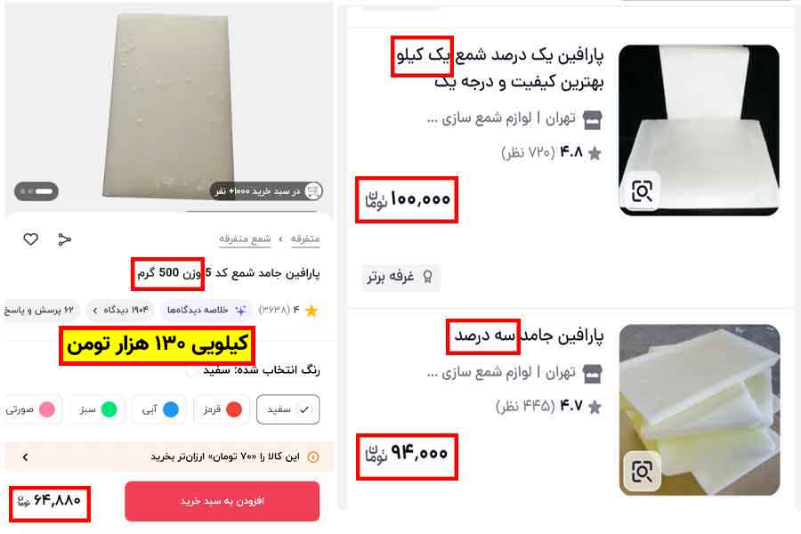 پس قیمت پارافین ۱ تا ۳ درصد که بیشترین کاربرد رو برای شمع سازی داره کیلویی ۱۰۰ به بالا شده (اونم معلوم نیست با چه کیفیتی!)